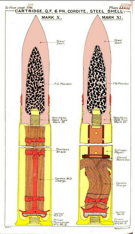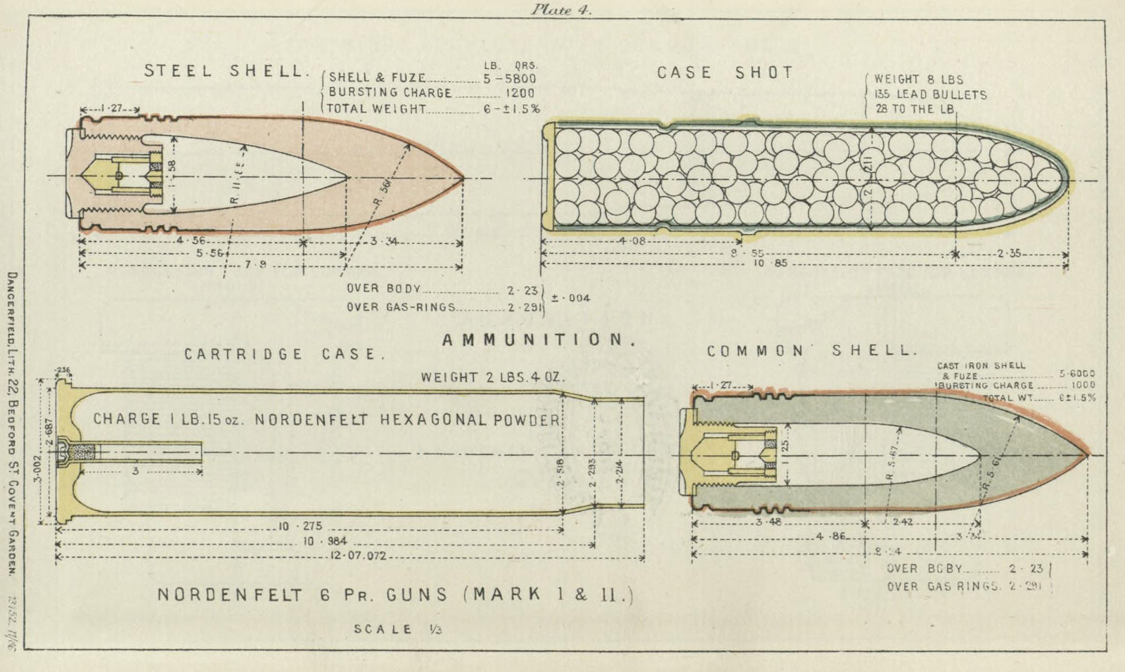 | 57X306R 6 prd. Maxim-Nordenfelt Maxim-Nordenfelt de 57mm perforante rompedor proyectil cobreado Pais: Reino Unido |